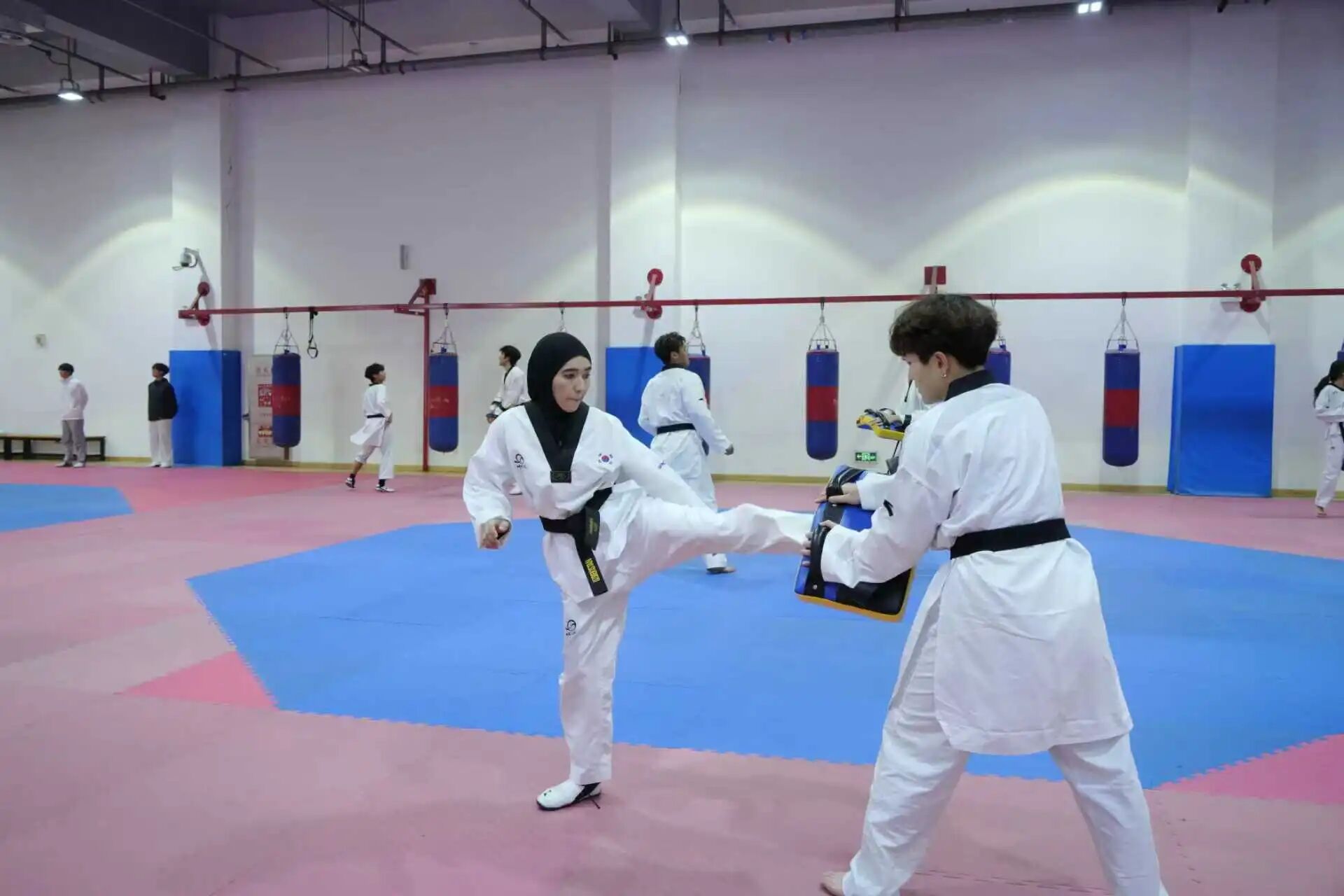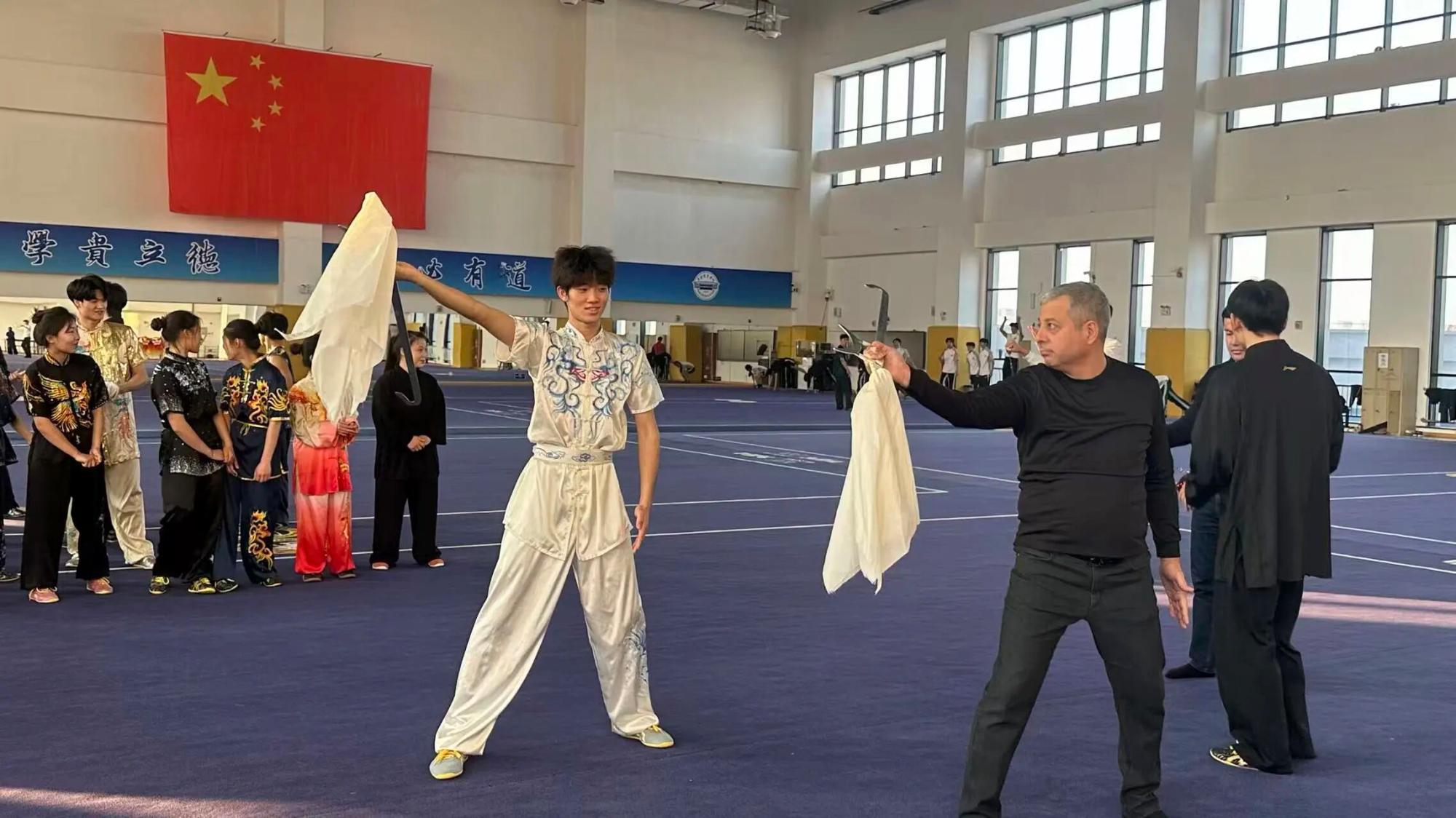 访问期间,代表团参与了我校组织的武术文化体验活动,观看了武术与民族传统体育学院师生带来的精彩表演,并亲自体验九节鞭、长棍、形意拳等传统武术项目,亲身感受中华武术的深厚底蕴。代表团与运动训练学院师生开展了跆拳道互动训练,双方就教学与训练方法、师生互访、联合集训等常态化交流机制进行了务实探讨。